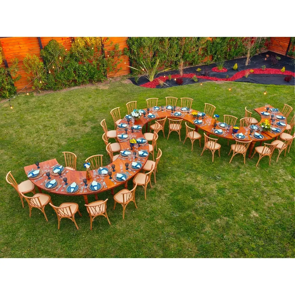 La Mesa Curva de Madera es una opción elegante y versátil para eventos, matrimonios, cenas corporativas y celebraciones al aire libre. Su diseño curvado permite crear composiciones únicas —como mesas en forma de “S”, círculos o líneas continuas—, aportando un toque de distinción y fluidez visual a cualquier montaje.
